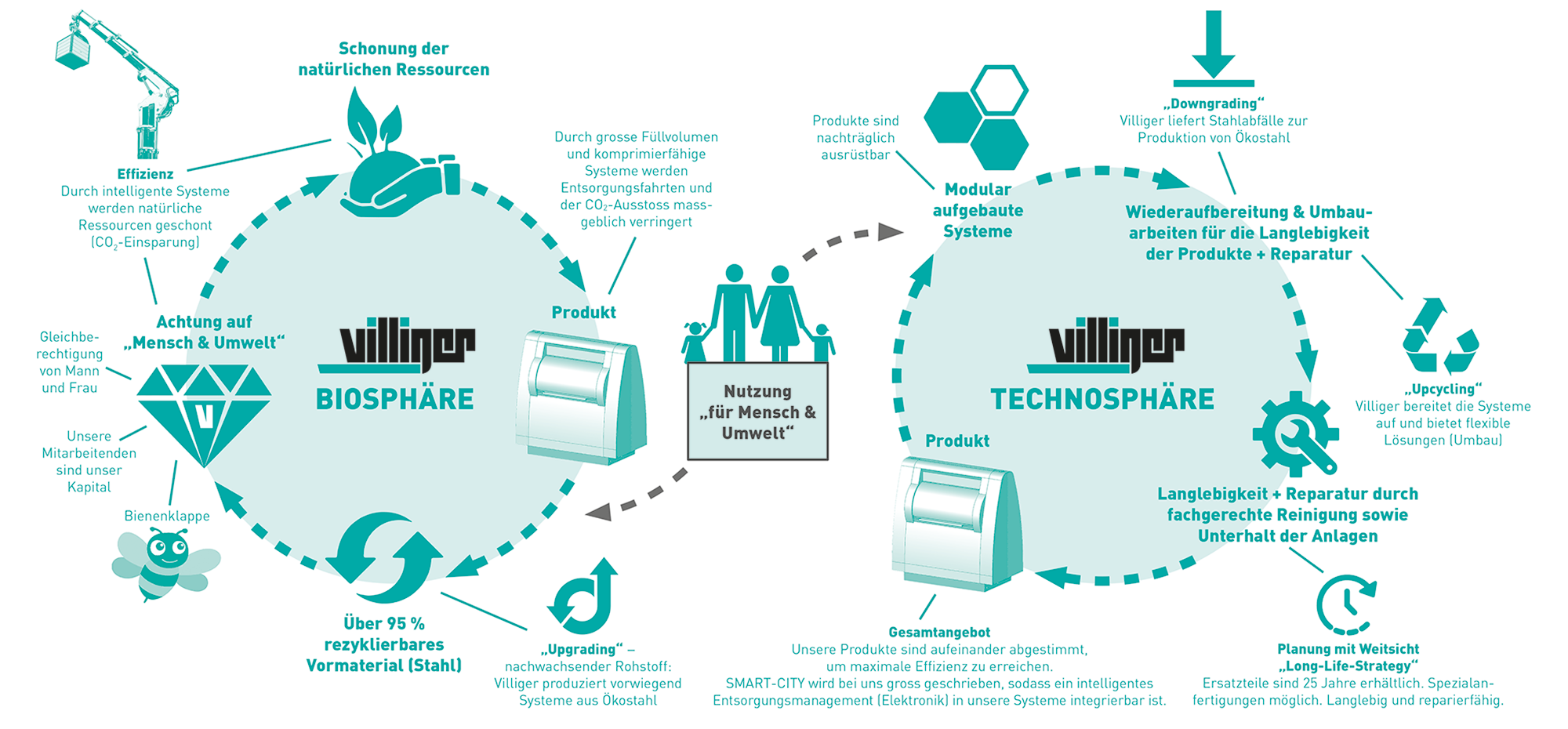 Der Nachhaltigkeitsansatz von Villiger basiert auf unseren Unternehmenswerten. So fliessen Innovativität, Langlebigkeit, Sicherheit und Verantwortung bereits bei der Konzipierung unserer Produkte mit ein. Die Umwelt und die natürlichen Ressourcen zählen wir zu den Anspruchsgruppen unserer Unternehmung, mit dem Bedürfnis, möglichst rücksichtsvoll und nachhaltig behandelt zu werden. Mit der Entwicklung und Fertigung von Entsorgungssystemen bilden wir die Grundlage für eine saubere Umwelt mit dem Ziel, die Ressourcen weitmöglichst zu schonen.