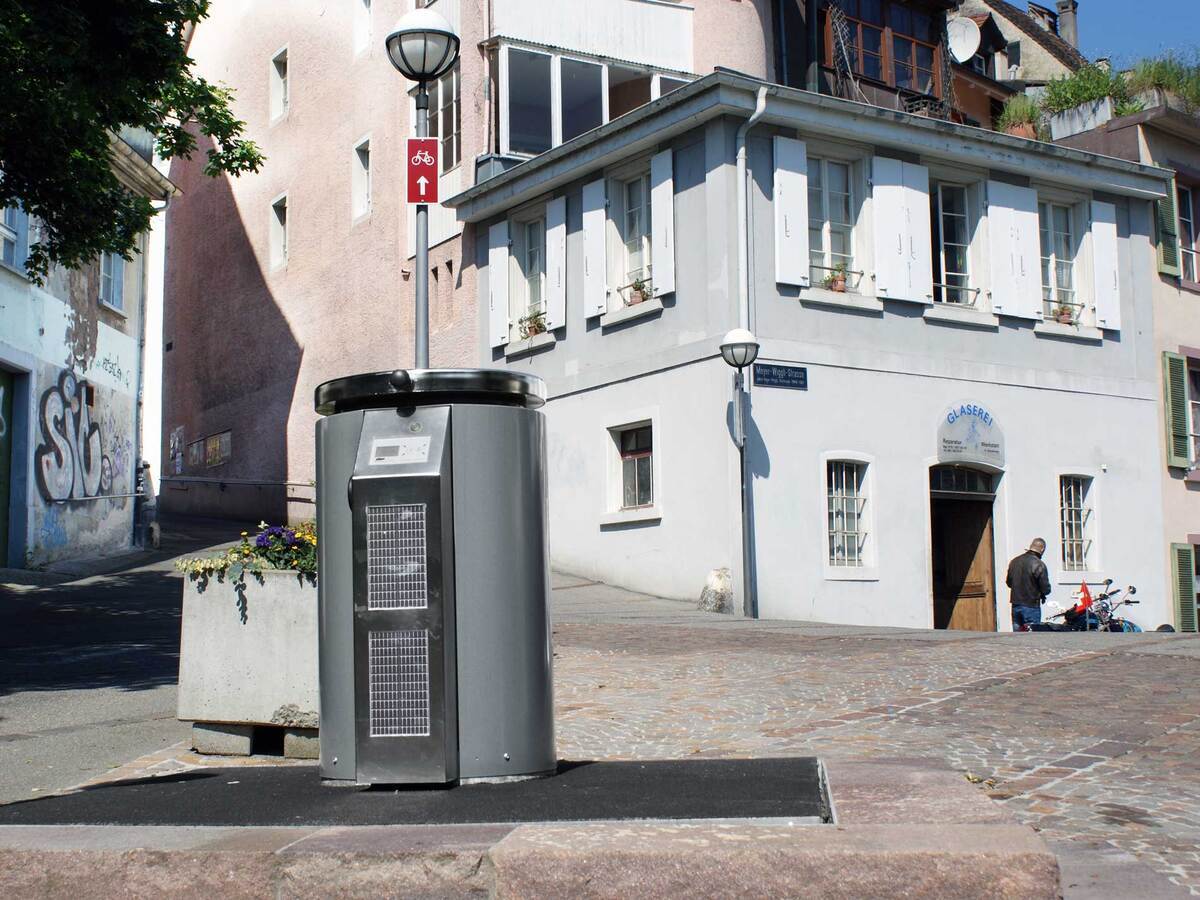 Die Einwurfsäule Caslano überzeugt durch kompromisslos funktionales Design. Diese Säule kann mit einem Zutritt-, Wiege- und Füllstandsystemen ergänzt werden. Durch Einbau einer Solaranlage ist ein autarker betrieb möglich.