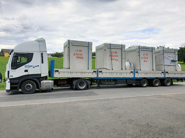 Dopo un procedimento di lavaggio, l'imballaggi in latta d'acciaio destagnato contengono ancora un contenuto trascurabile di stagno dello 0,04 %. Segue il trasporto alla fonderia.