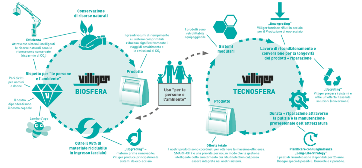 L'approccio di Villiger alla sostenibilità si basa sui nostri valori aziendali. Innovazione, durata, sicurezza e responsabilità sono incorporate nel design dei nostri prodotti. Consideriamo l'ambiente e le risorse naturali tra gli stakeholder della nostra azienda, che devono essere trattati nel modo più attento e sostenibile possibile. Con lo sviluppo e la fabbricazione di sistemi di smaltimento, formiamo la base per un ambiente pulito con l'obiettivo di conservare il più possibile le risorse. Grazie al continuo sviluppo, Villiger è in grado di raccogliere tutti i tipi di rifiuti nel maggior volume possibile per ridurre notevolmente le emissioni di CO2 dei processi di smaltimento. Come fornitore globale, siamo riusciti a ottimizzare in modo significativo la gestione dello smaltimento dei rifiuti perché la nostra gamma di prodotti è perfettamente coordinata. Per esempio, i nostri sistemi di smaltimento possono essere svuotati nel minor tempo possibile e con la massima sicurezza grazie al nostro sollevatore di rifiuti a velocità completamente automatizzata. Il portafoglio di prodotti è completato da offerte di servizi, in modo da poter retrofittare, riparare, mantenere e pulire tutti i sistemi.
